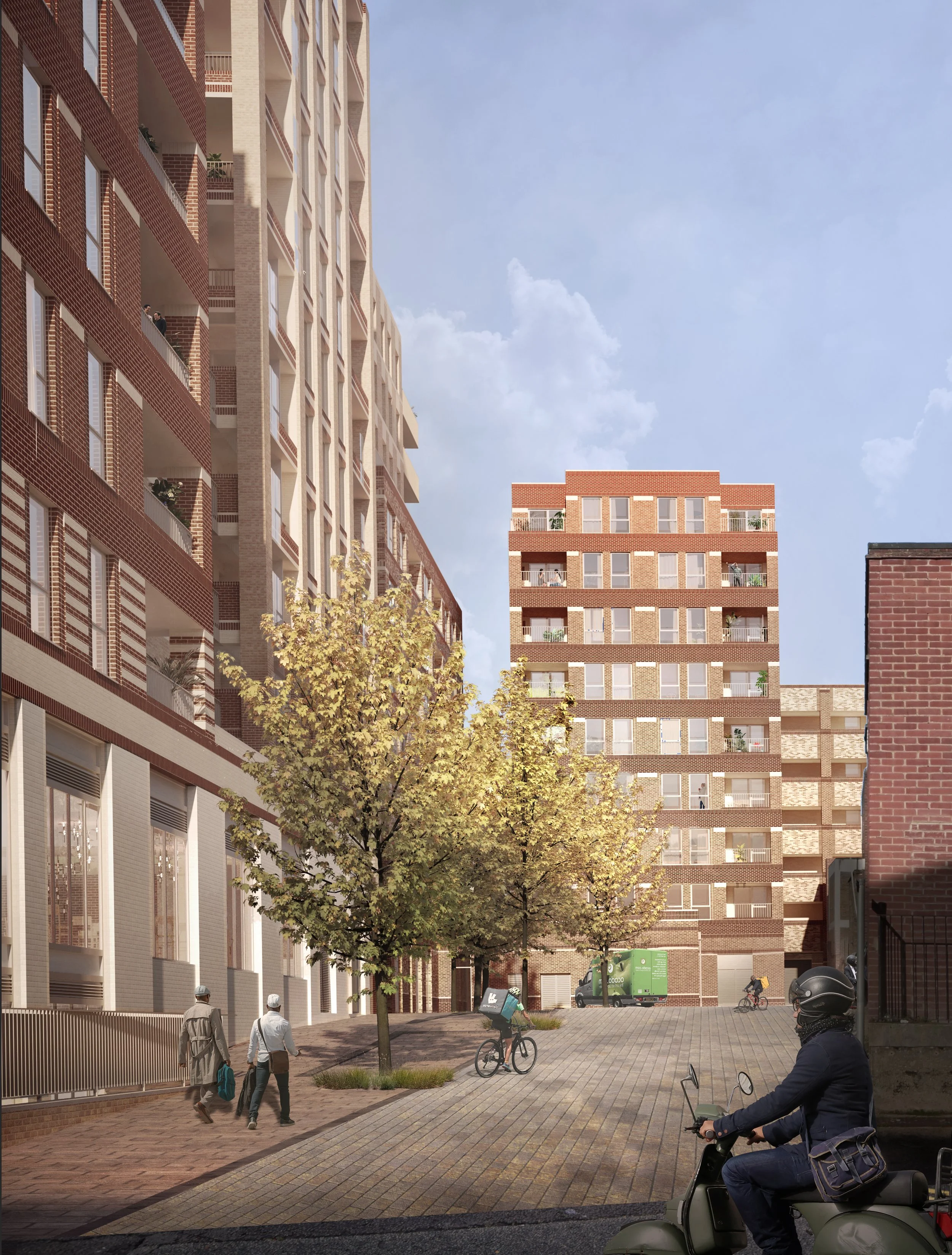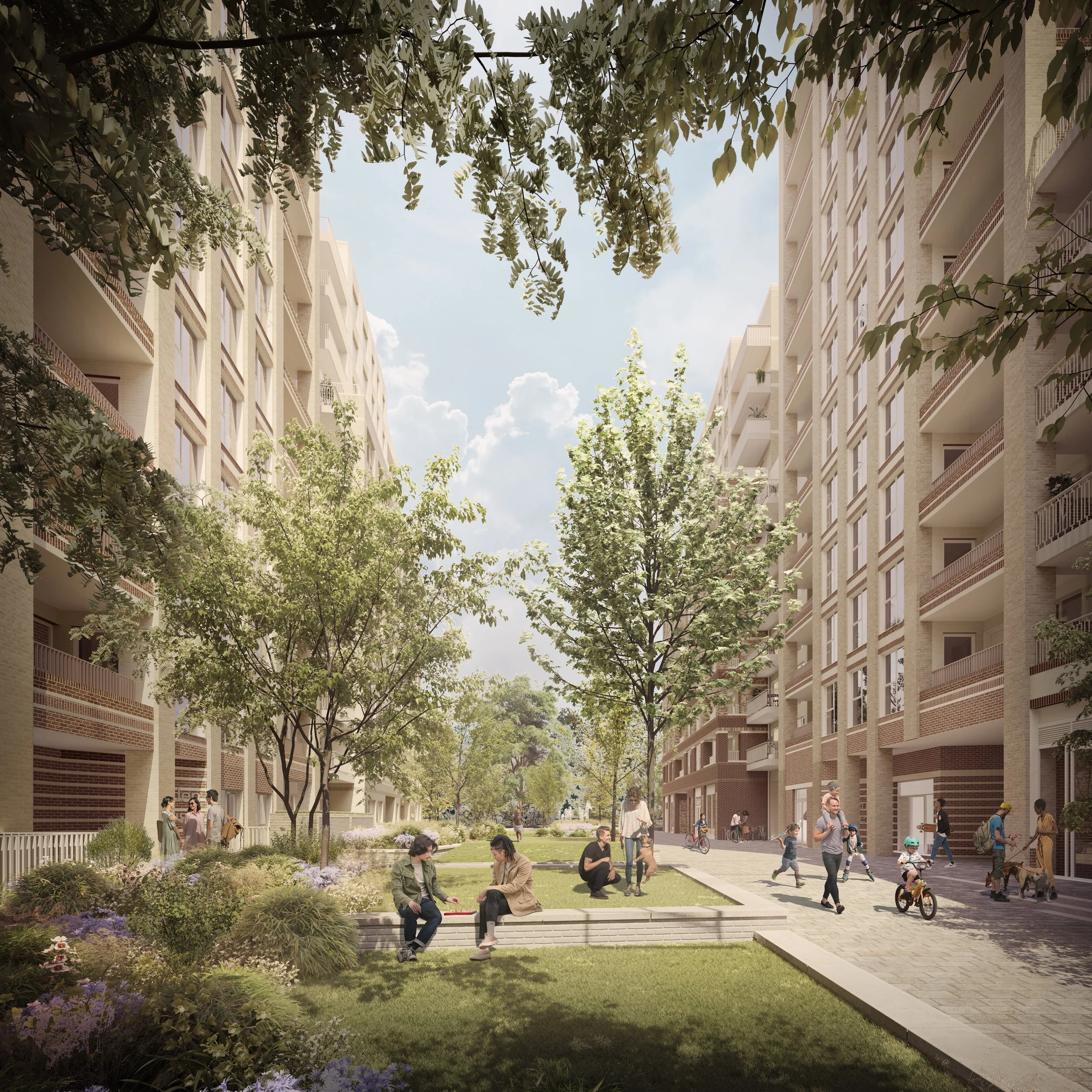 Careful use of levels across the site allows all servicing to be from lower levels, allowing the pedestrian experience of the public spaces to be celebrated, and for active frontages onto the landscaped spaces to be optimised.