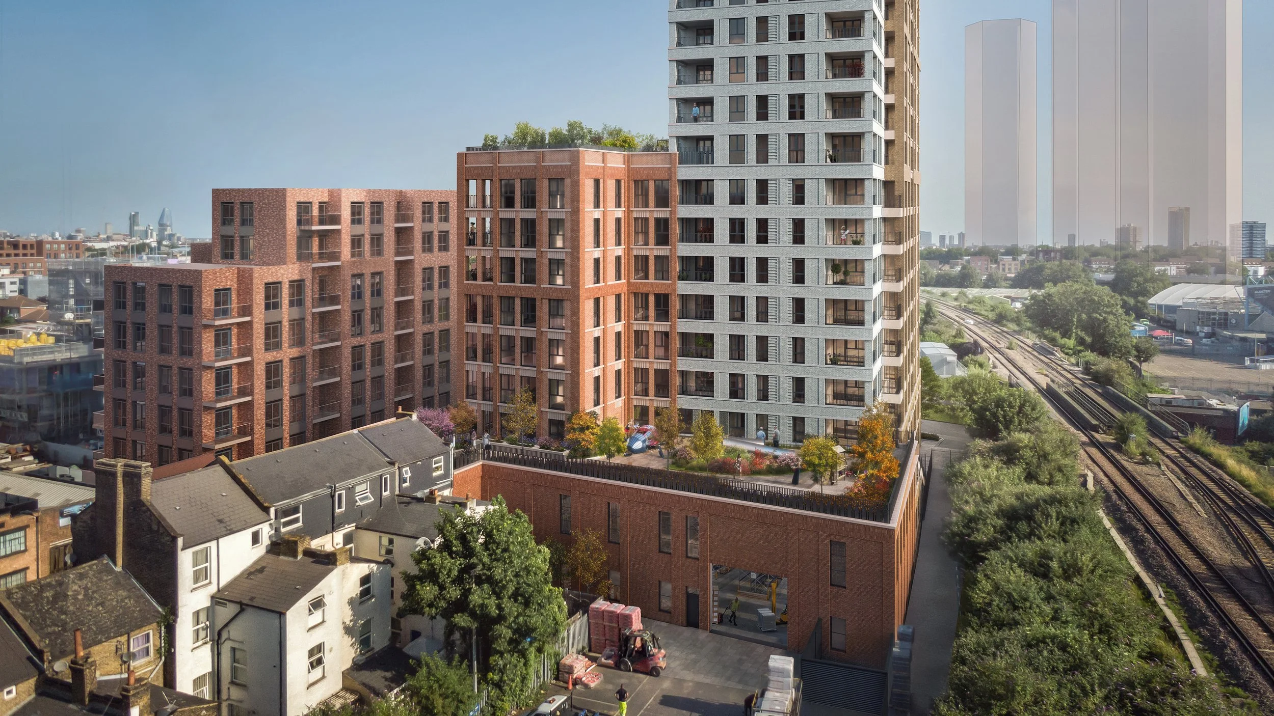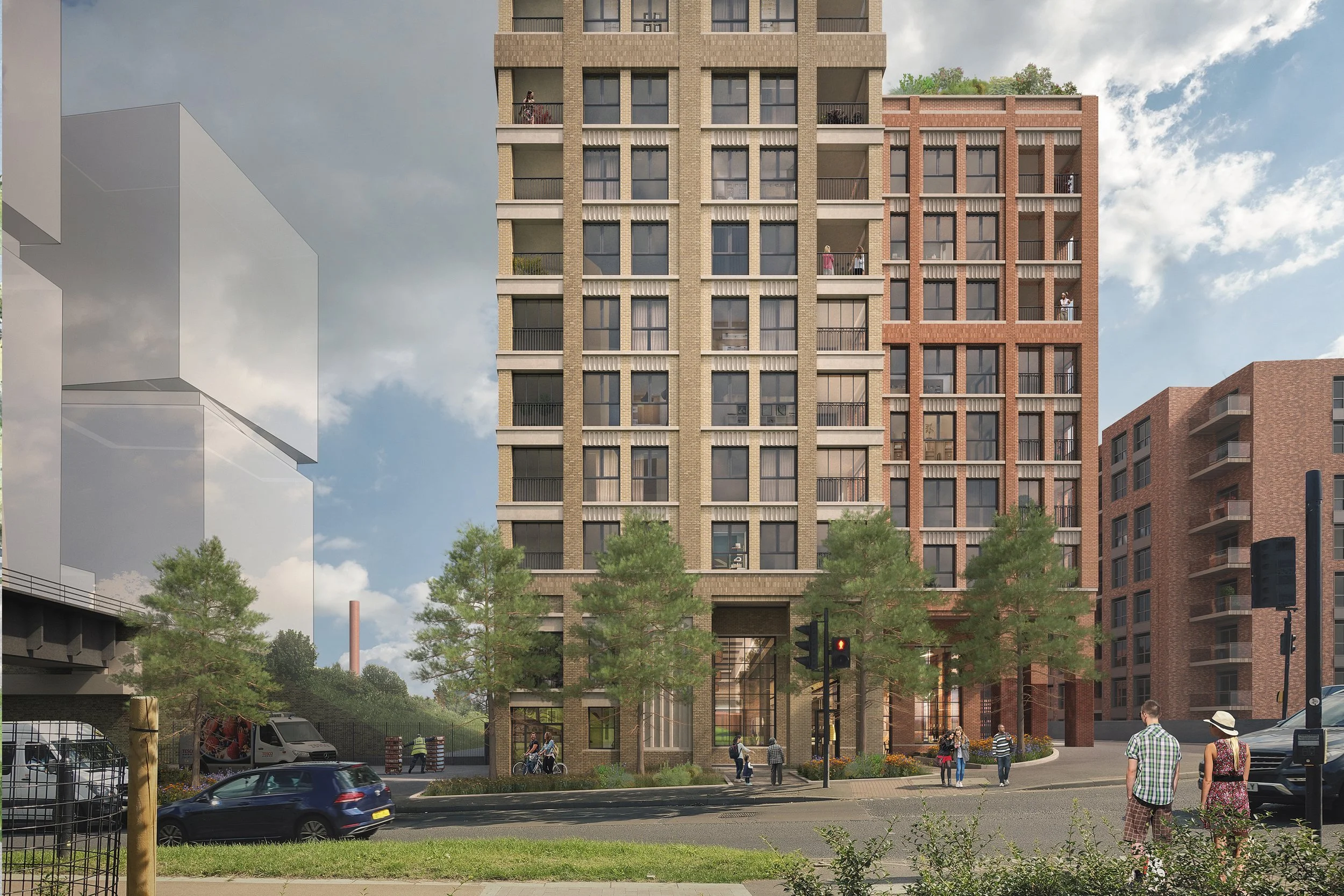 An exemplar mixed-use development within the Old Kent Road masterplan, co-locating over 170 homes with a new industrial yard and street-facing commercial spaces.