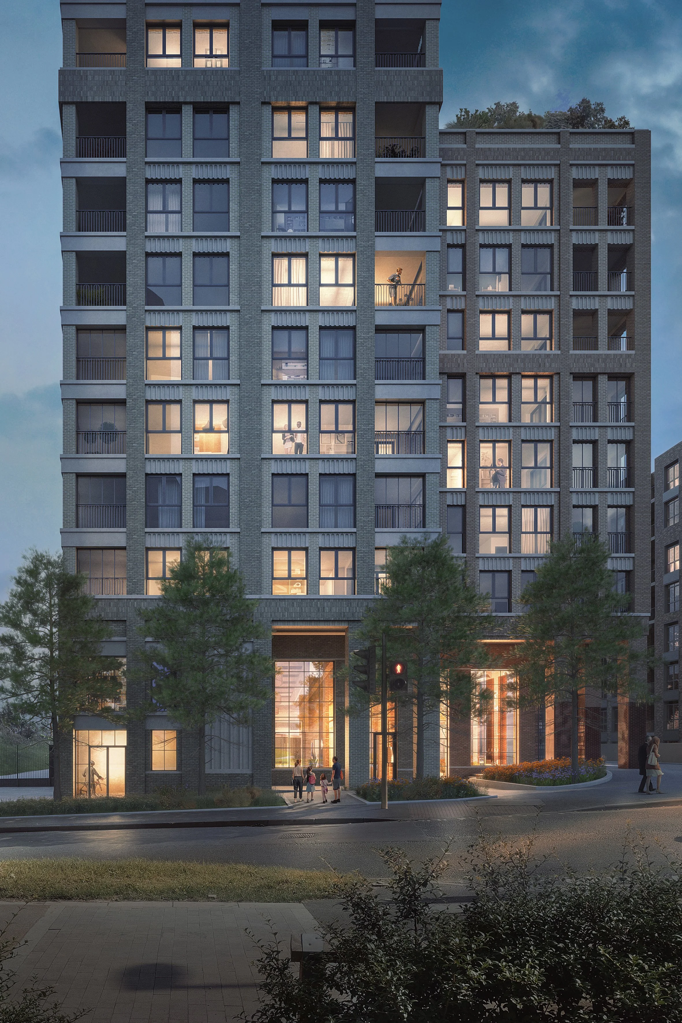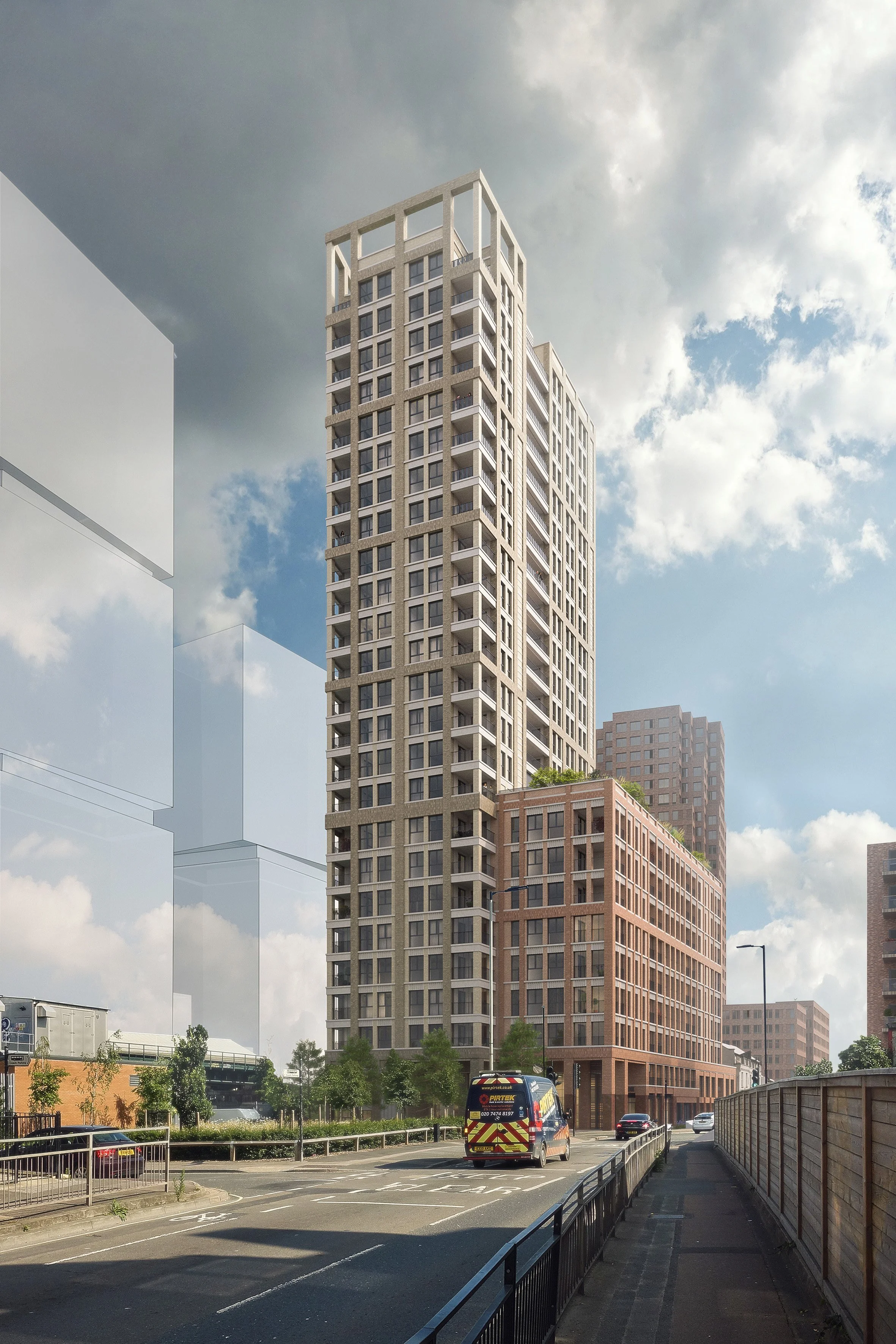Above the industrial spaces, 9 and 25 storey residential buildings contain over 170 apartments with a high degree of dual aspect and oversized balconies for every home. The scheme creates a series of large south-facing terraces providing all the play and amenity space for under 18’s on-site, and all communal amenity spaces are accessible to all residents. The mixed tenure blocks have generous double-height entrances activating the street and the showroom has a prominent position on the street corner.